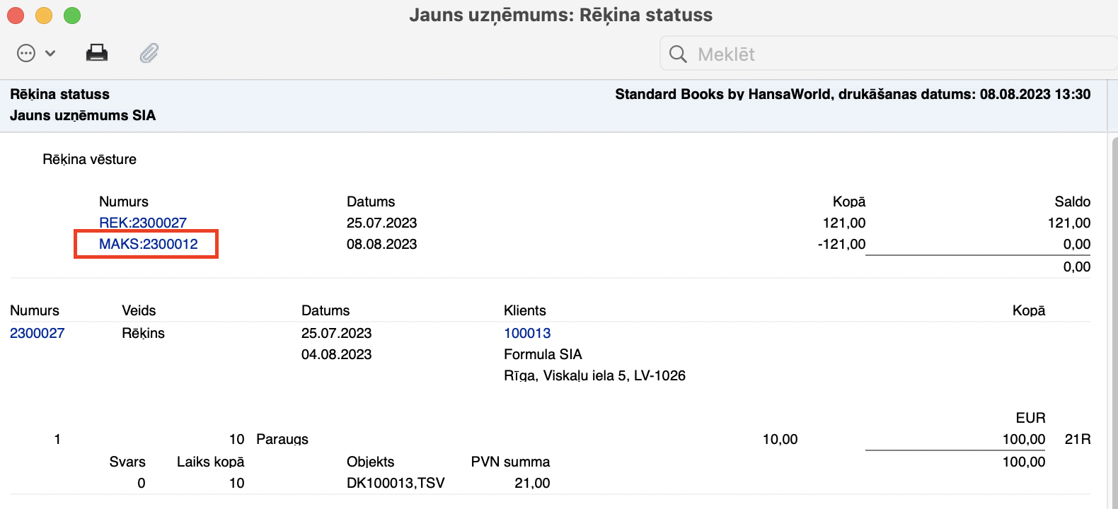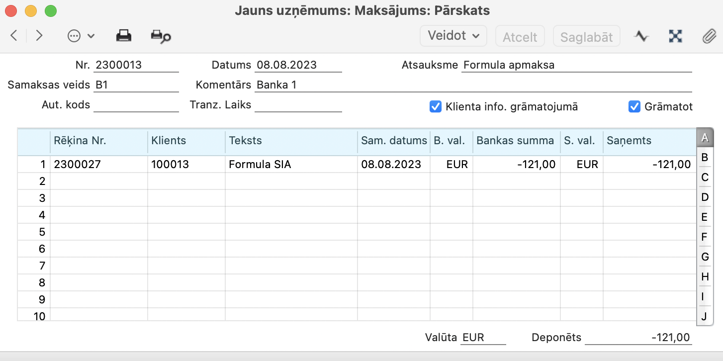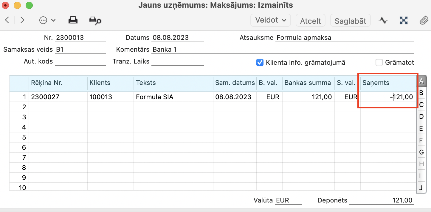 NB! Ja sākotnējais maksājuma ieraksts ietvēra arī citu rēķinu apmaksu, tad pirms ieraksta grāmatošanas atbilstošās samaksas rindas ir jāizdzēš.