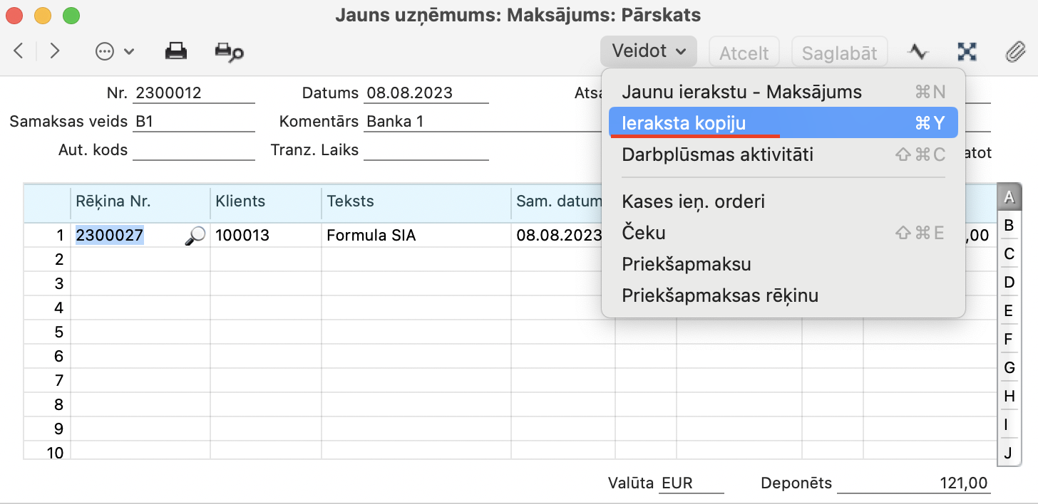 b) jāsameklē maksājumu Realizācija > Reģistri > Maksājumi manuāli un izveidojiet tā kopiju, izmantojot “Veidot – Ieraksta kopiju”.