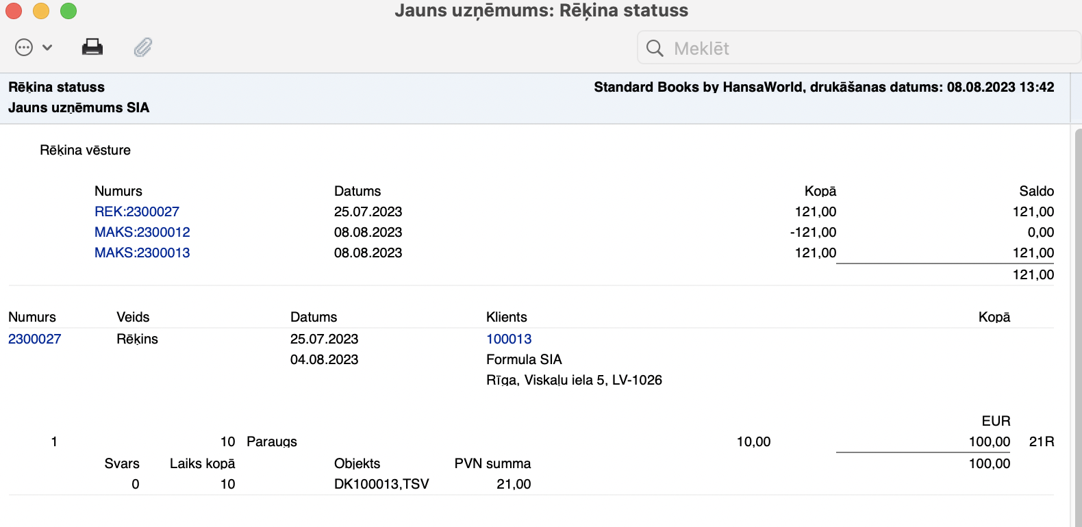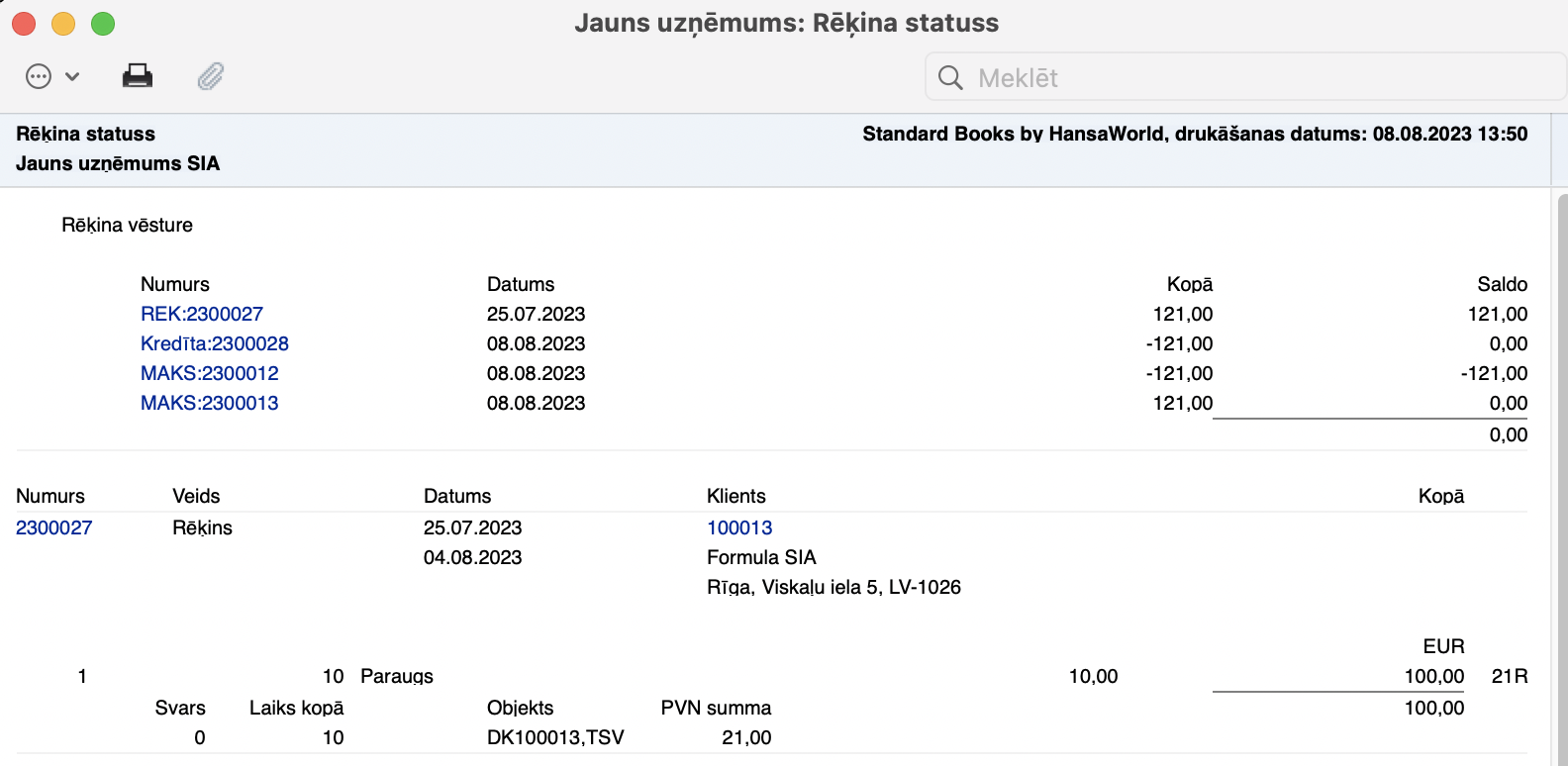 Ar šo rīcību jūs anulēsiet, kreditēsiet sākotnējo rēķina ierakstu. Kredītrēķina izdruku varēsiet nosūtīt klientam pa e-pastu. Kā arī Rēķina saldo tagad radīsies 0 , ja pārbaudīsiet Rēķina statusa atskaiti.
