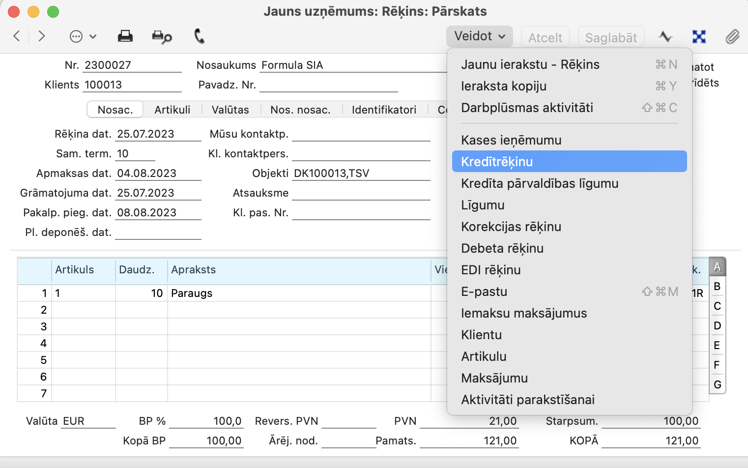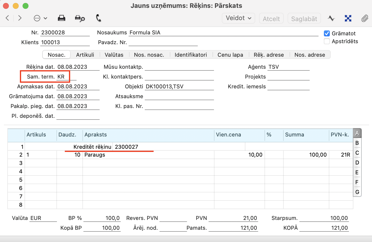 Rezultātā programma izveidos kredītrēķina ierakstu, ar kredītrēķina kodu laukā “Samaksas termiņš” un kreditējamā rēķina numuru laukā “Kreditēt rēķinu”.