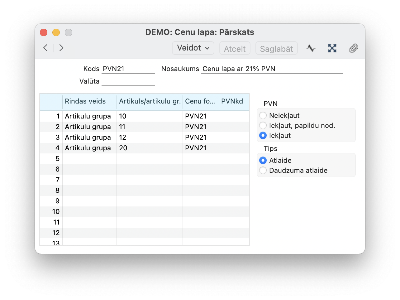 - ievada visas nepieciešamās artikulu grupas vai/un specifiskus artikulus (izvēloties pirmajā kolonnā Rindas veids: artikuls)