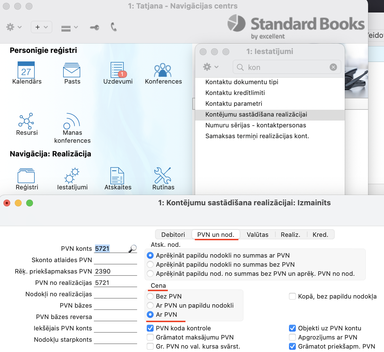 Pēc noklusējuma Standard Books iestatījumos artikula cena uzstādīta bez PVN. To var mainīt, veicot dažus papildinājumus iestatījumos.