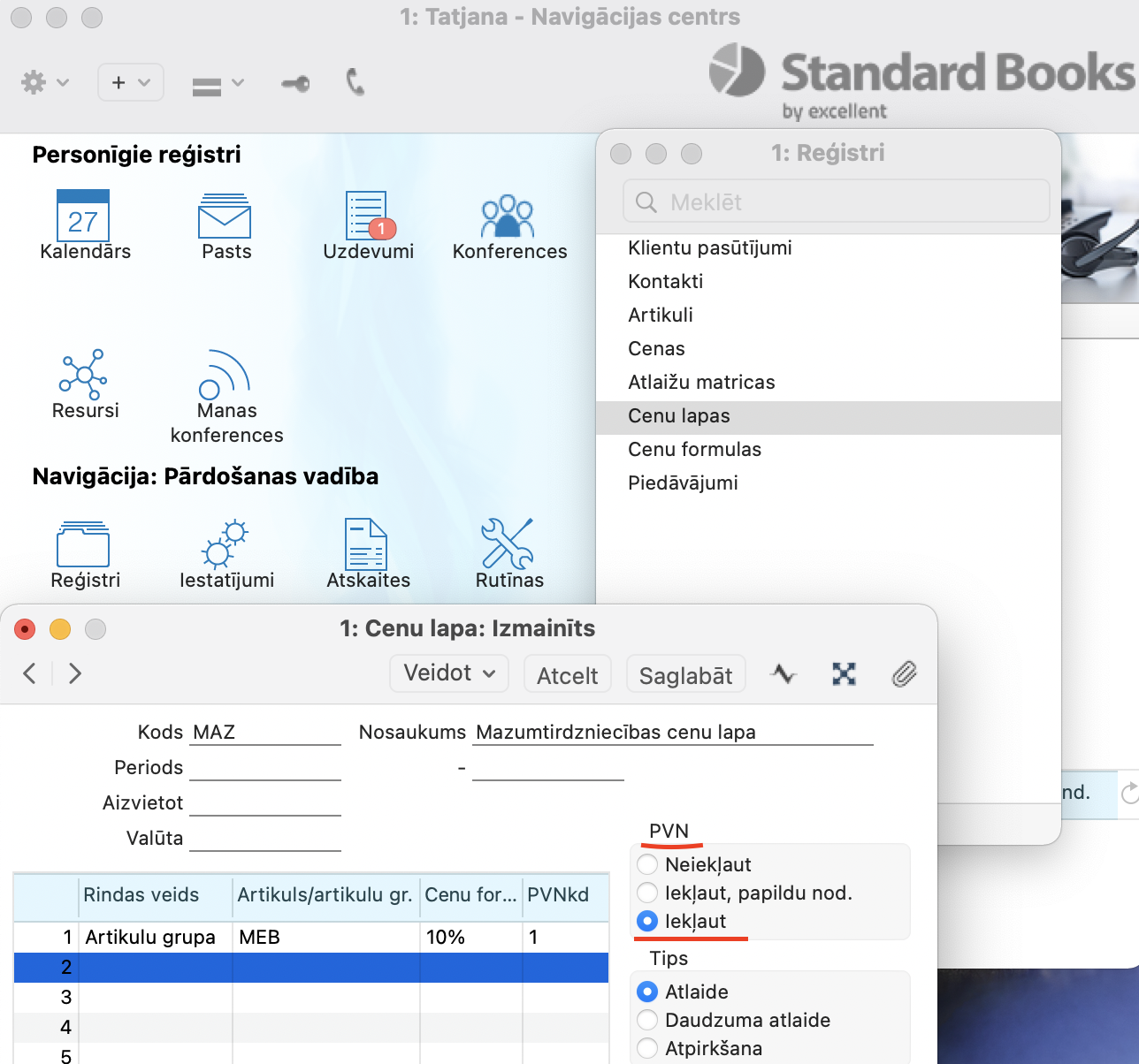 Standard Books saviem klientiem piedāvā iespēju veidot pārdošanas dokumentus tādos reģistros kā Piedāvājumi, Klientu pasūtījumi, Rēķini, izmantojot artikula cenu ar un bez PVN.