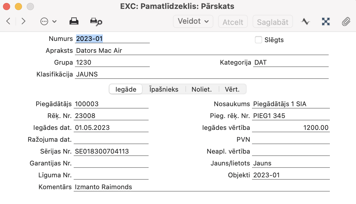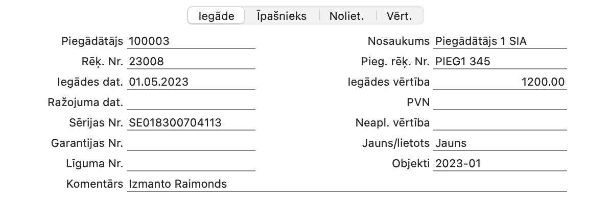 Gadījumā, ja Pamatlīdzekļa kartīte tika izveidota no ienākoša rēķina, tas tiks ņemts no ienākoša rēķina lauka “Pieg. rēķ. Nr.”
