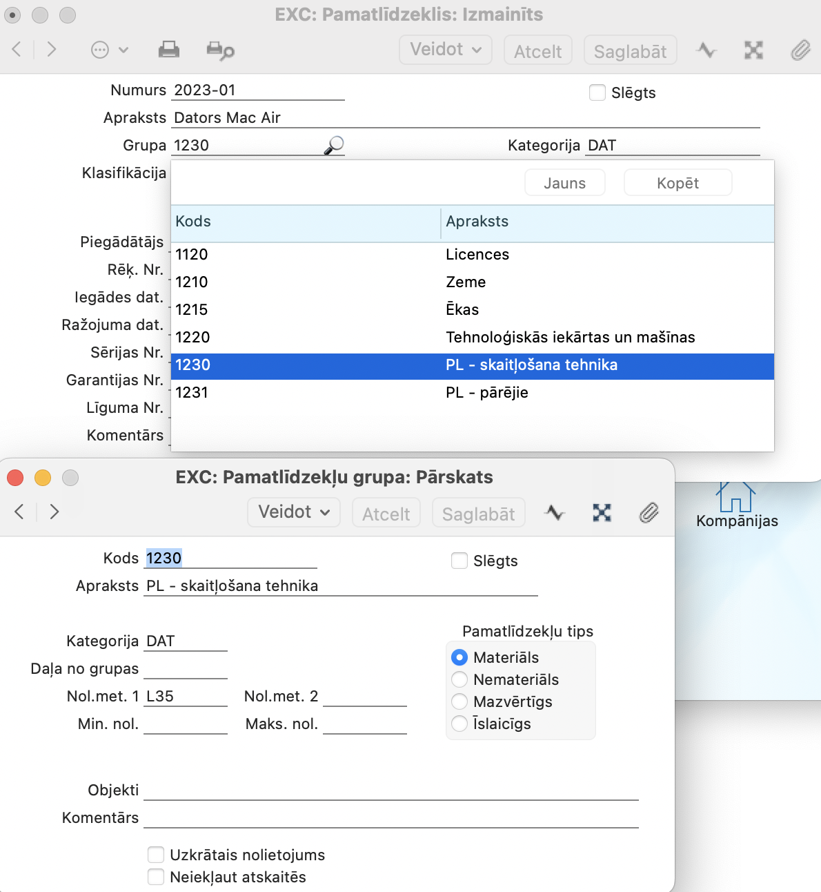 Pēc noklusējuma ņemts no Ienākoša rēķina, Pamatlīdzekļu kategorijas