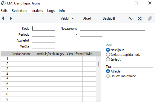 - Parastajā Cenu lapā atstājiet laukus “Periods” un “Aizvietot” tukšus.