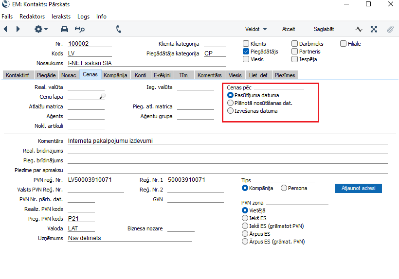 Piedāvājumu un izejošo rēķinu gadījumā, nosakot periodu, tiek ņemts vērā piedāvājuma un rēķina datums. Pasūtījumu gadījumā izšķirošais var būt Pasūtījuma, Plānotās izsūtīšanas vai Nosūtīšanas datums. Tas tiek noteikts, pamatojoties uz Klienta kartītes sadaļā “Cenas” veikto izvēli “Cenas pēc”.