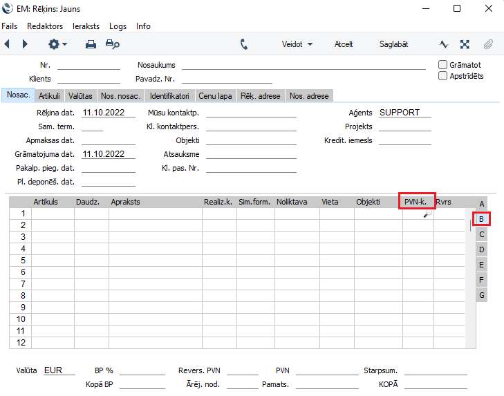 Veidojot realizācijas rēķinu modulī Realizācija >Reģistri Rēķini > Veidot – Jauns rēķins > B daļā (labajā pusē) izvēlieties pareizo PVN kodu kolonnā “PVN-k”. Katrā rindā vari izvēlēties atšķirīgu PVN kodu.