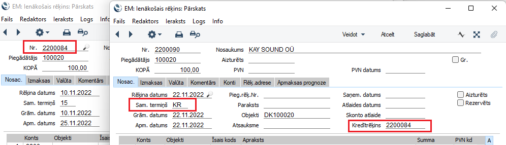 - Parādīsies papildu rinda, kur laukā “Kredītrēķins” ievietosies tas skaidrās naudas rēķina numuru, kuram vēlaties sastādīt kredītrēķinu. Pārbaudiet vai numuri sakrīt un saglabājiet.