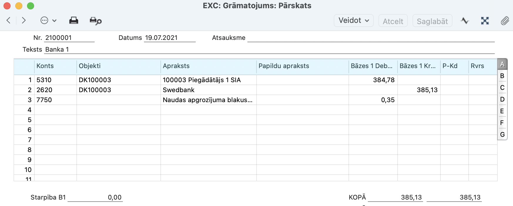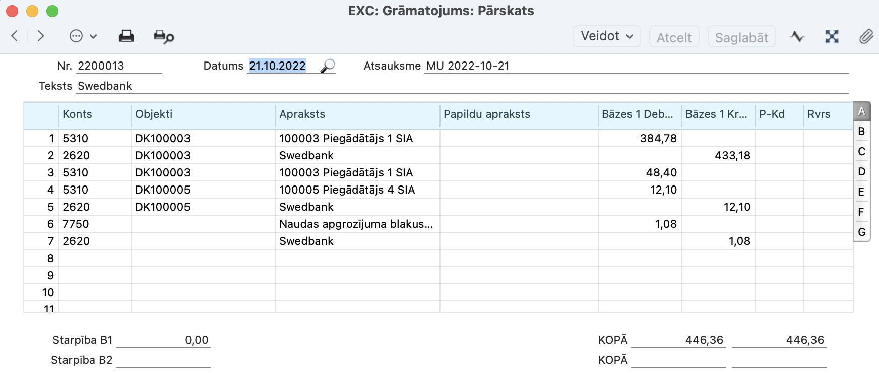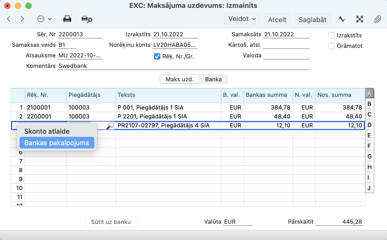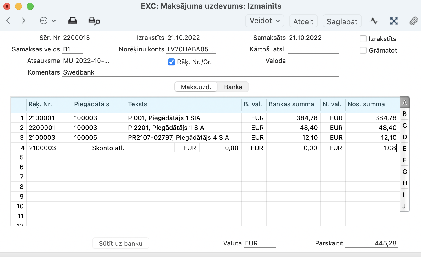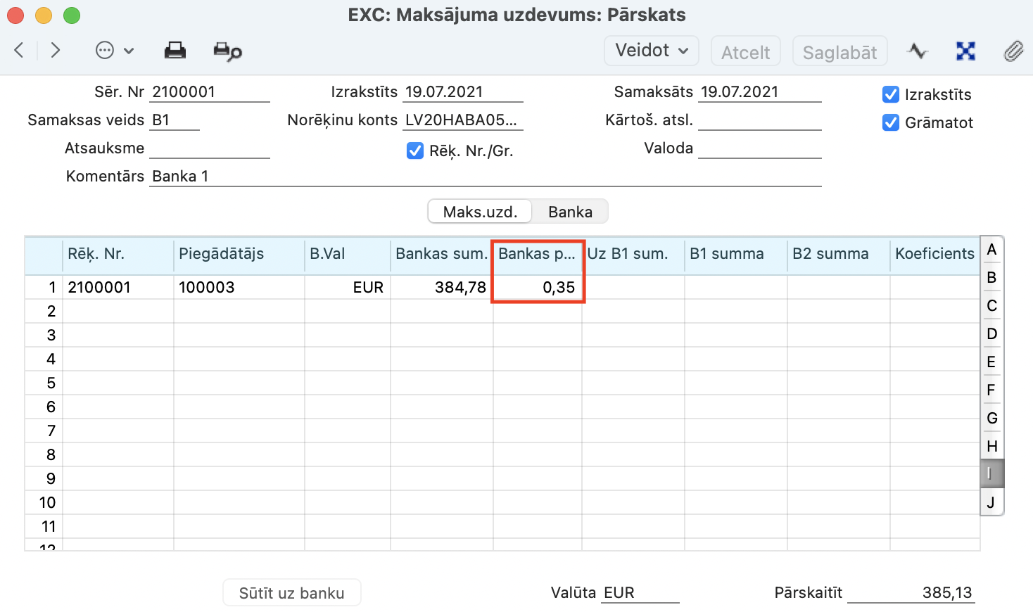 Maksājuma uzdevuma Grāmatojuma ierakstā, tiek kreditēts Bankas izmaksu konts, kas noteikts Piegādātāji > Iestatījumi > Kontējumu sastādīšana piegādātājiem > sadaļā Kreditori.