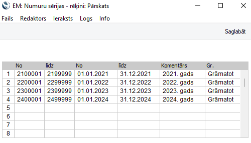 Ievadiet sēriju, datumus no un līdz un komentāru. Skaitļu sērijai katru gadu jābūt unikālai, t.i., tā nedrīkst būt tāda pati kā iepriekšējā gadā. Piemēram, skaitļu sērija 2200001 – 2299999 pieder pie 2022. gada, pirmā ieraksta numurs ir 2200001 un pēdējā ieraksta numurs ir 2299999.