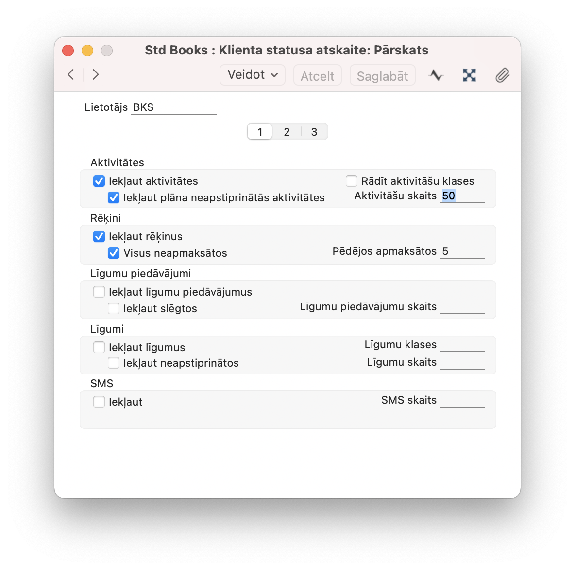 Laukā “Lietotājs” norāda savu lietotāju, izvēloties to no saraksta. Atzīmē izvēles rūtiņas ierakstiem, kuras lietotājs vēlas redzēt klienta statusa atskaitē. Svarīgi ir norādīt arī ierakstu skaitu katrā atzīmētajā izvēlē.