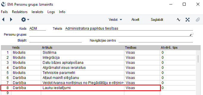 1. Nepieciešams iedot piekļuvi lauku iestatījumu mainīšanai katrai Personu grupai atsevišķi. Ejiet uz moduli Sistēma > Iestatījumi > Personu grupas > pievienojiet darbību “Lauka iestatījumi” > Visas tiesības.