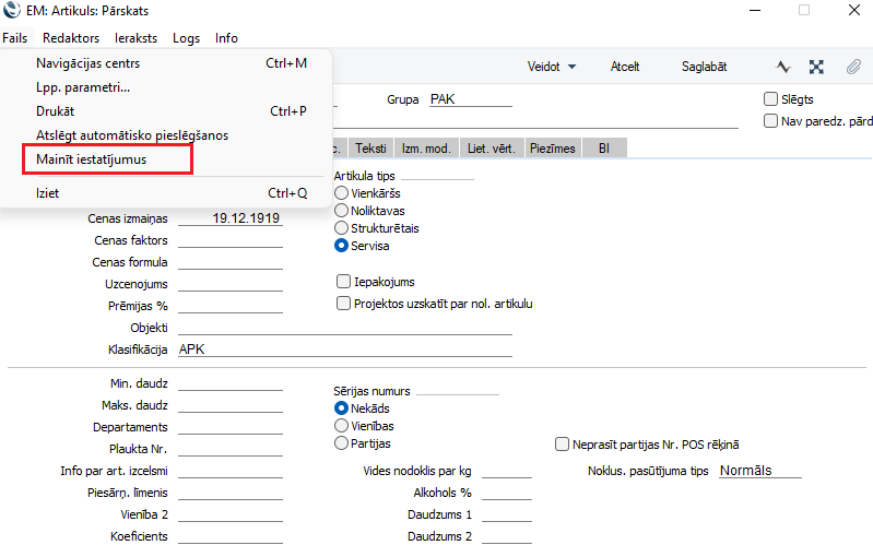 2. Atveriet reģistru, kurā jūs vēlaties veikt izmaiņas. Piemēram, Artikula kartīte un atveriet Fails > Mainīt iestatījumus.
