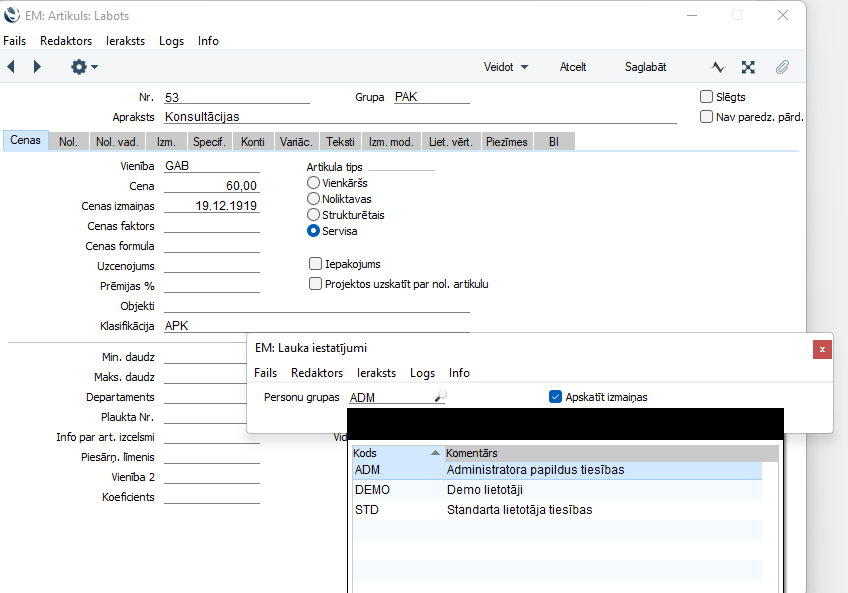 Pielāgotos iestatījumus var redzēt mudulī Tehniskie parametri > Iestatījumi > Lauka iestatījumi. Ja vēlaties tādus pašus iestatījumus citai Personu grupai, tad nokopējiet esošo ierakstu ar Veidot ieraksta kopiju > nomainiet Personu grupu un saglabājiet.