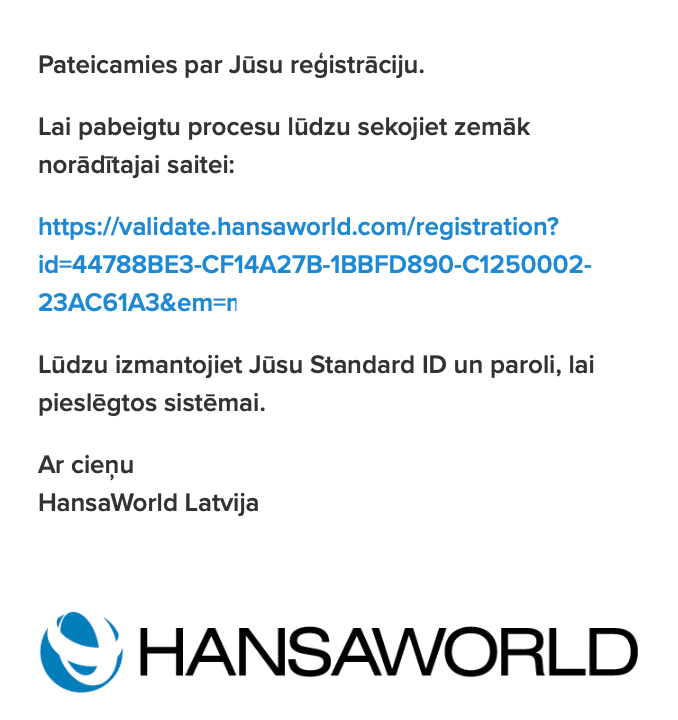 4. Lietotājam jāsagaida e-pastā sekojošu paziņojumu (ja vēl nav veikta StandardID lietotāja reģistrācija ):