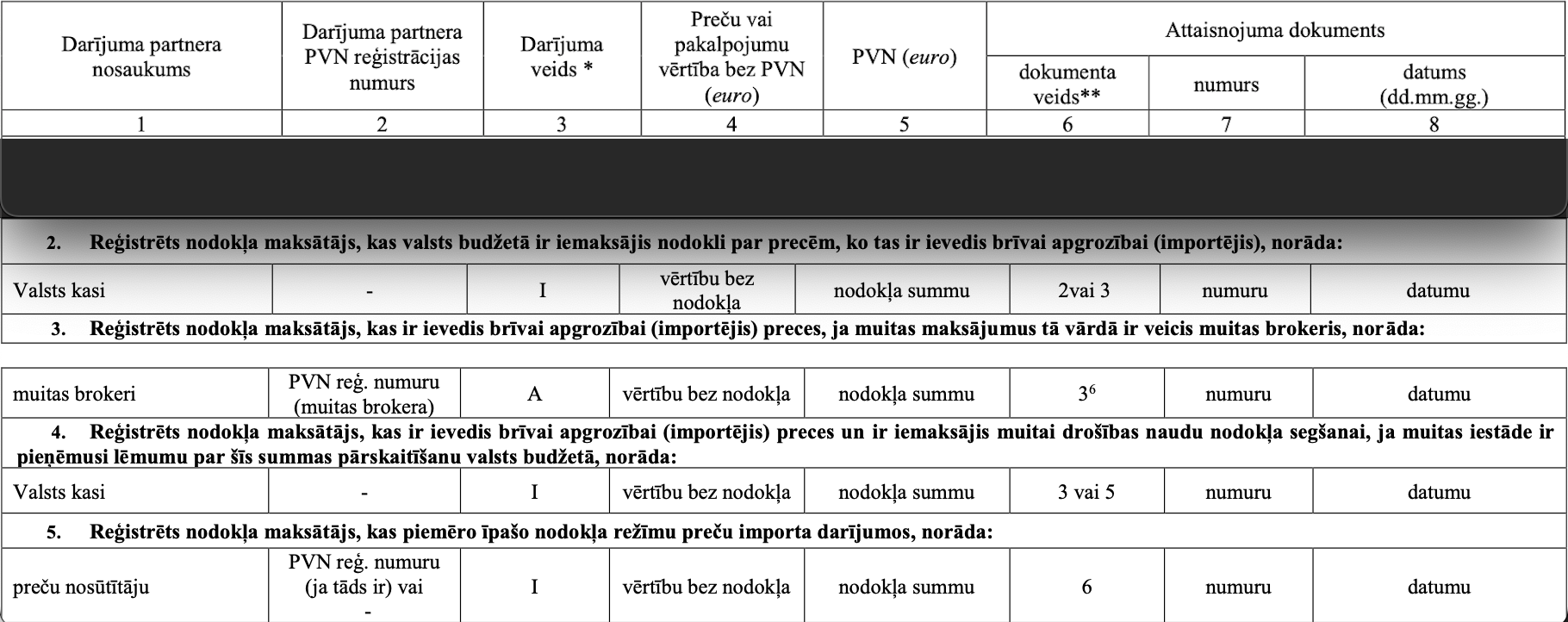 - 6 (muitas deklarācija) – kods “6”, ja reģistrēts nodokļa maksātājs ir importējis preces saskaņā ar īpašo nodokļa režīmu preču importa darījumos.