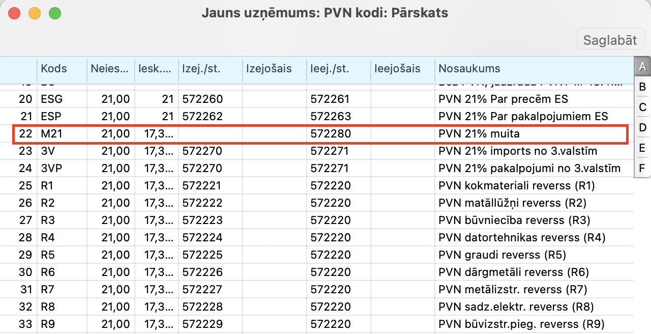 Rindai ar PVN muitas kontu 572280, kā norādīts piemērā augšā, ievietojam PVN kodu (M21), kuram ir pielietots nodokļu likums 3 ar nodokļa tipa kodu “3” un nodokļa kodu “I”.