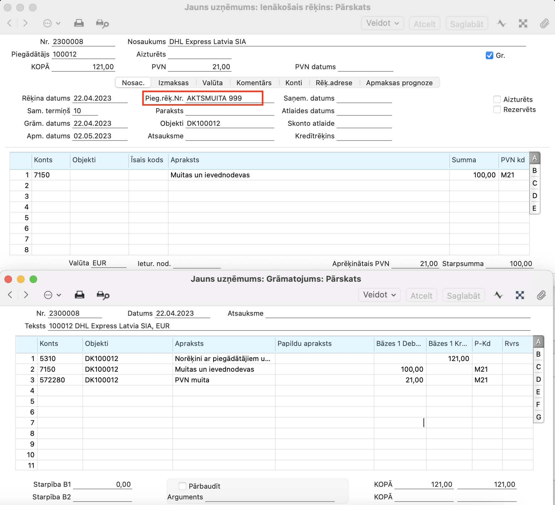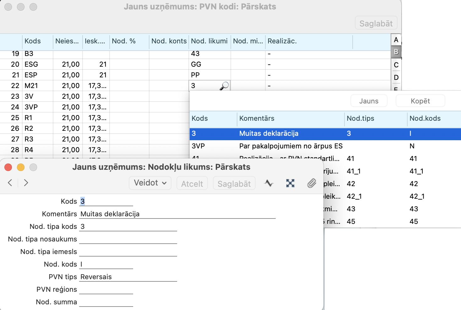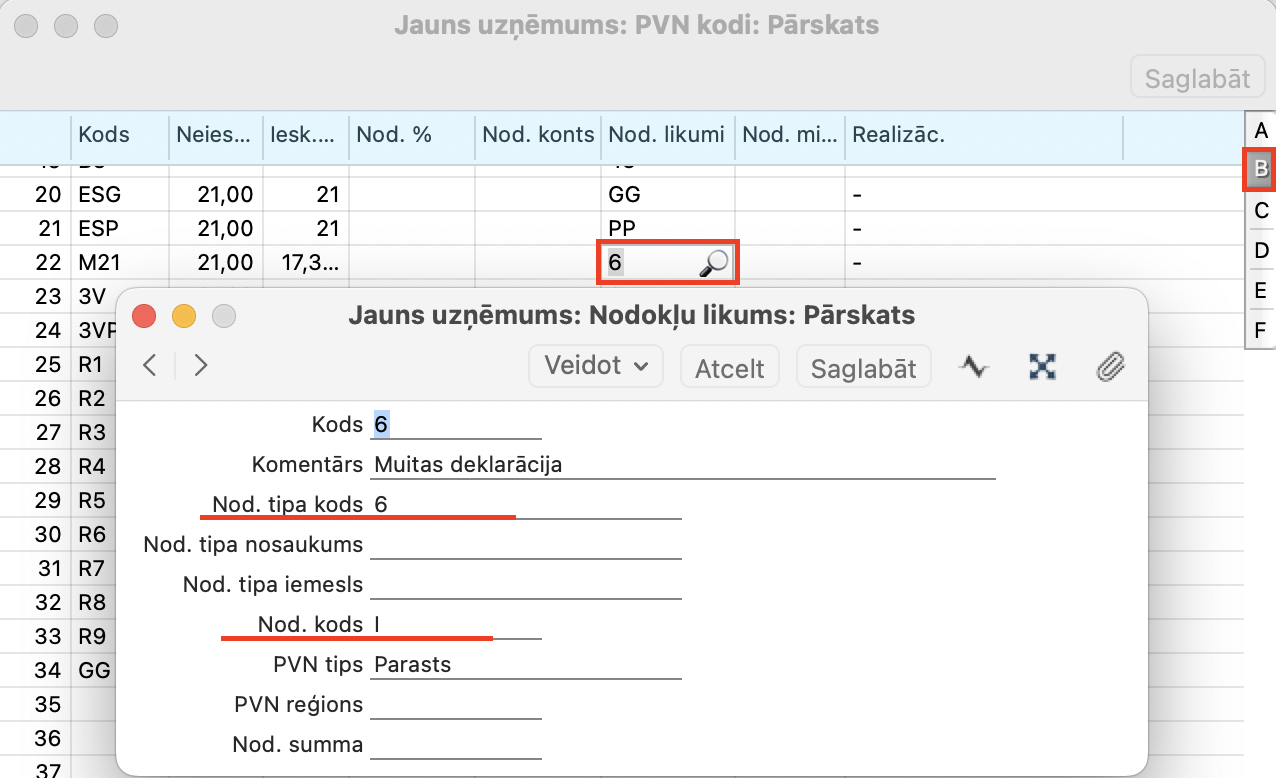 1. Finanses > Iestatījumi > PVN kodi > jābūt nodefinētam muitas PVN kodam, piemēram M21, un iestatījuma sadaļā B, tam kodam jāpieliek Nodokļu likumu, piemēram 6 vai 3.