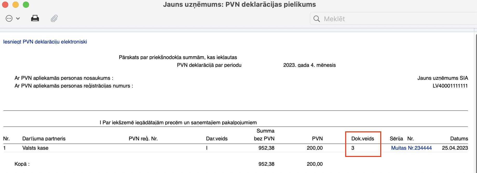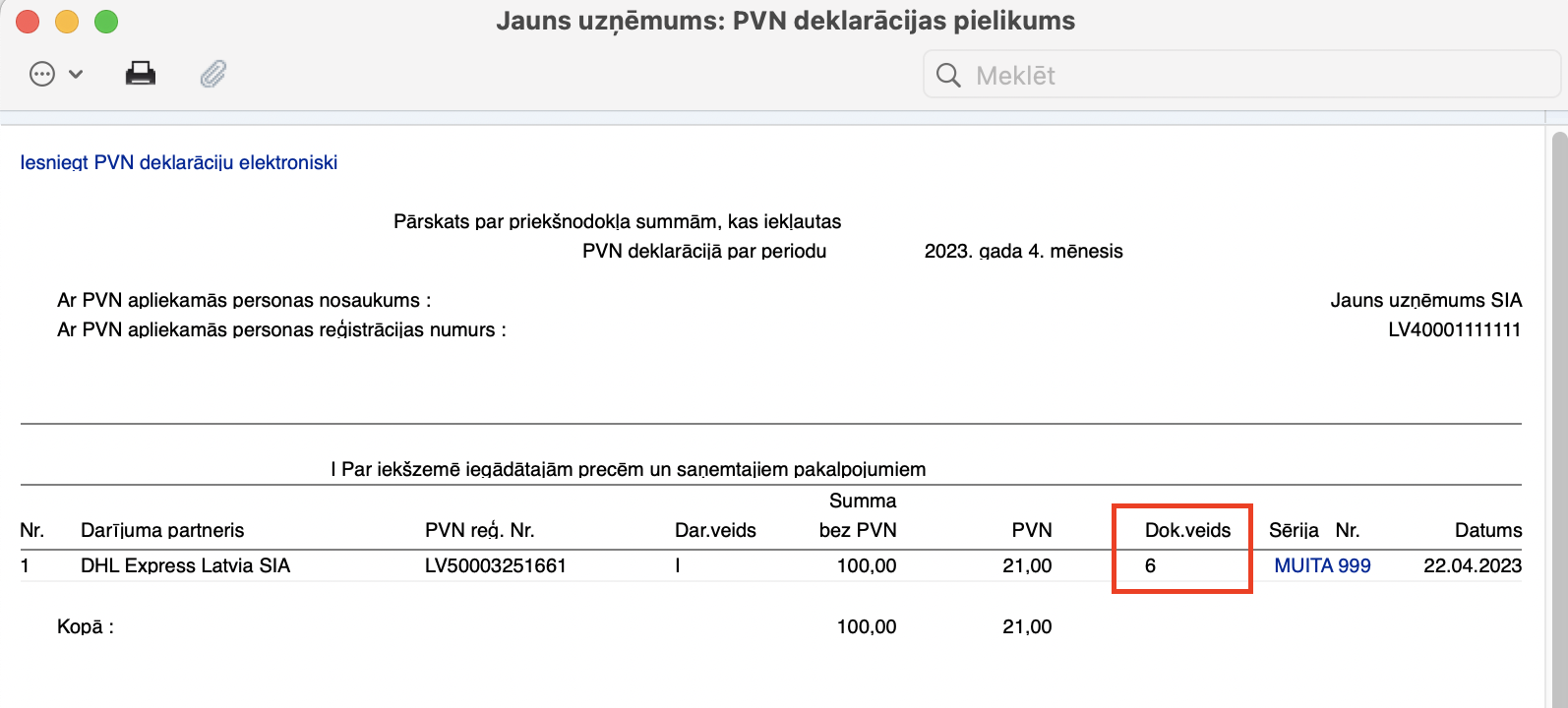 - Nodokļa tipa kodam – PVN deklarācijas pielikumā PVN1-I tas tiek atspoguļots kolonnā zem nosaukuma “Dokumenta veids”