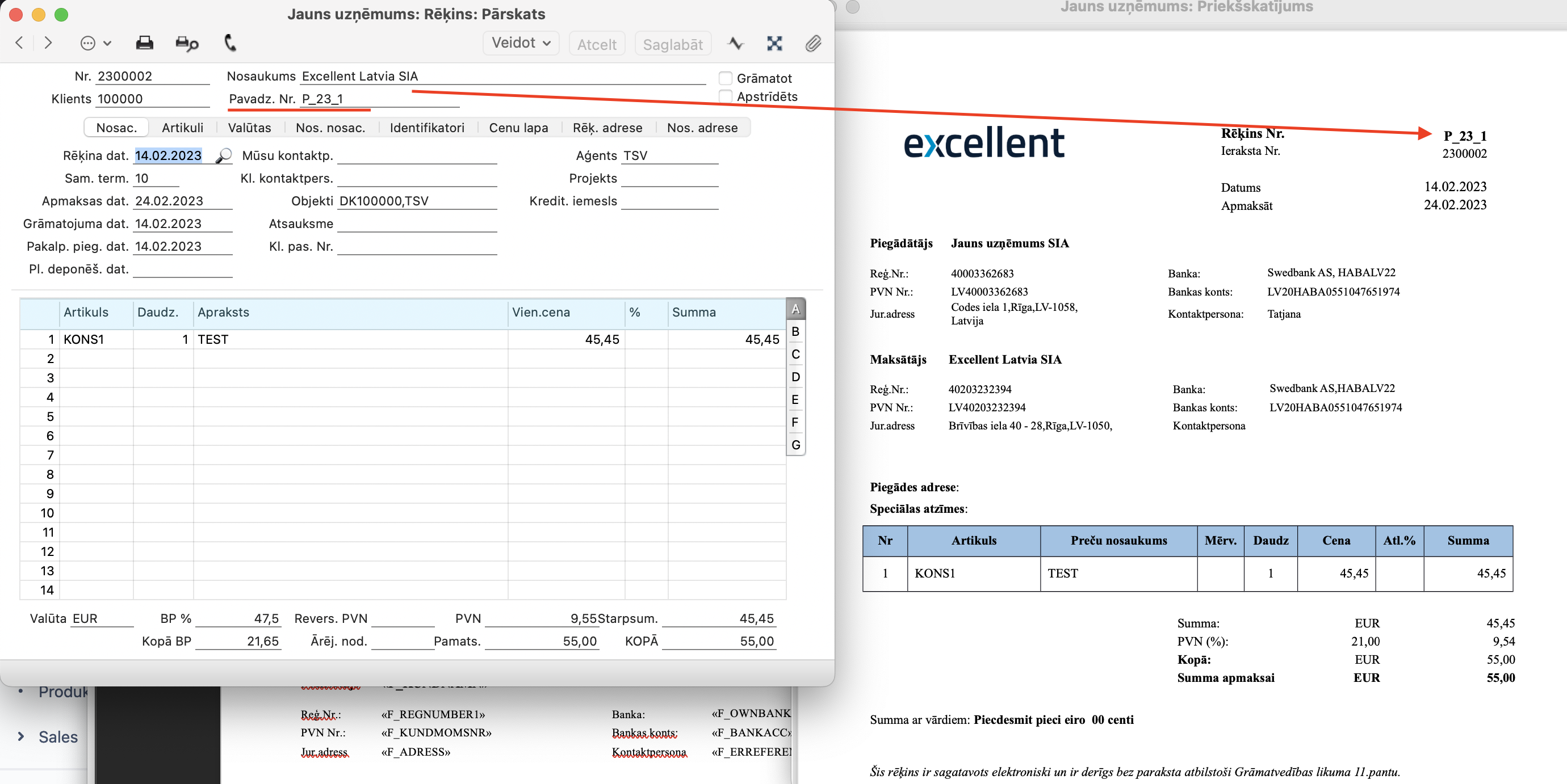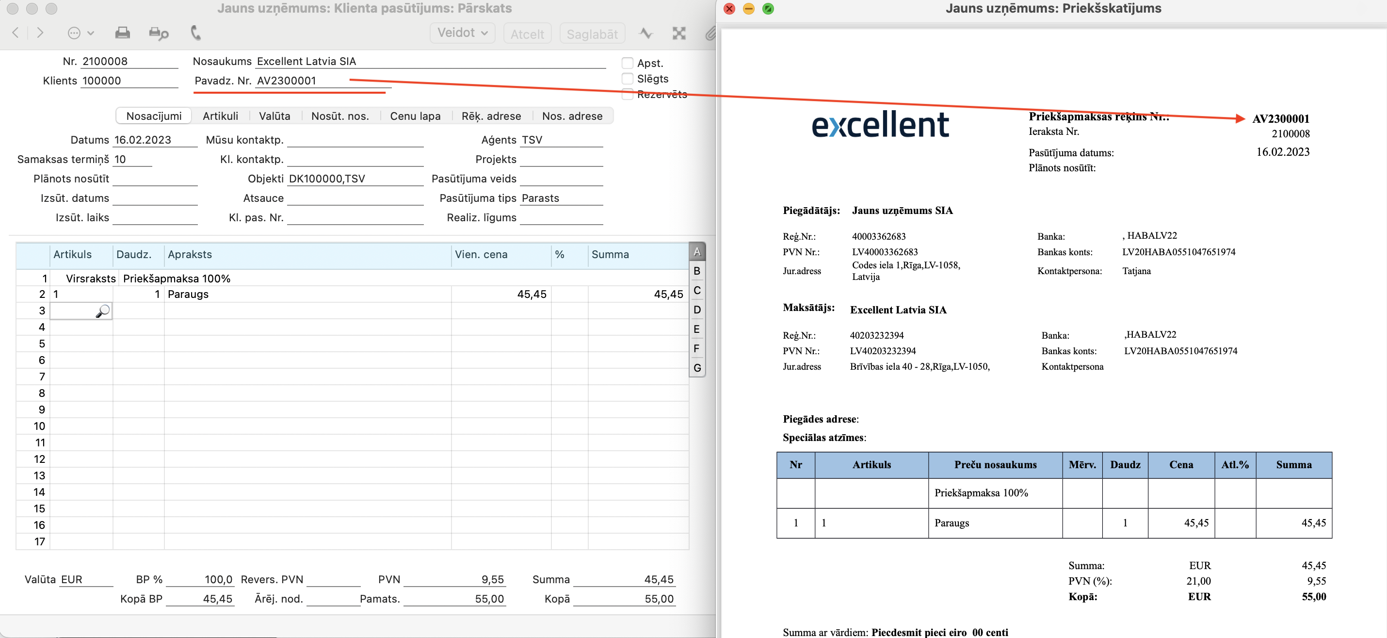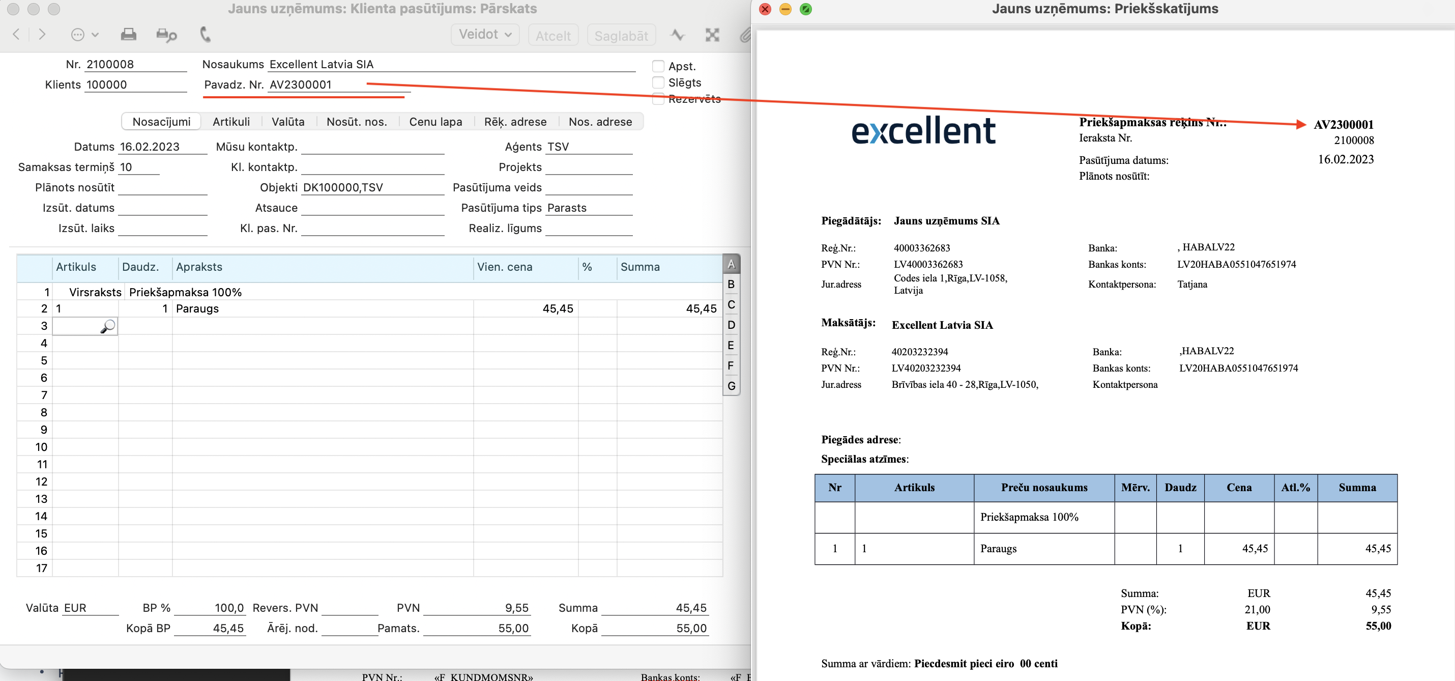 2. Rezultātā jūsu Klienta pasūtījums (Priekšapmaksas rēķins) vai Rēķins (ar Pavadzīmes numuru) izskatīsies šādi: