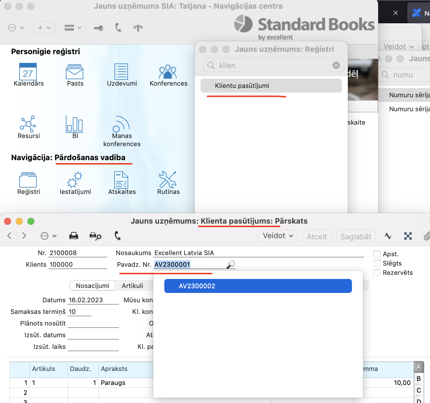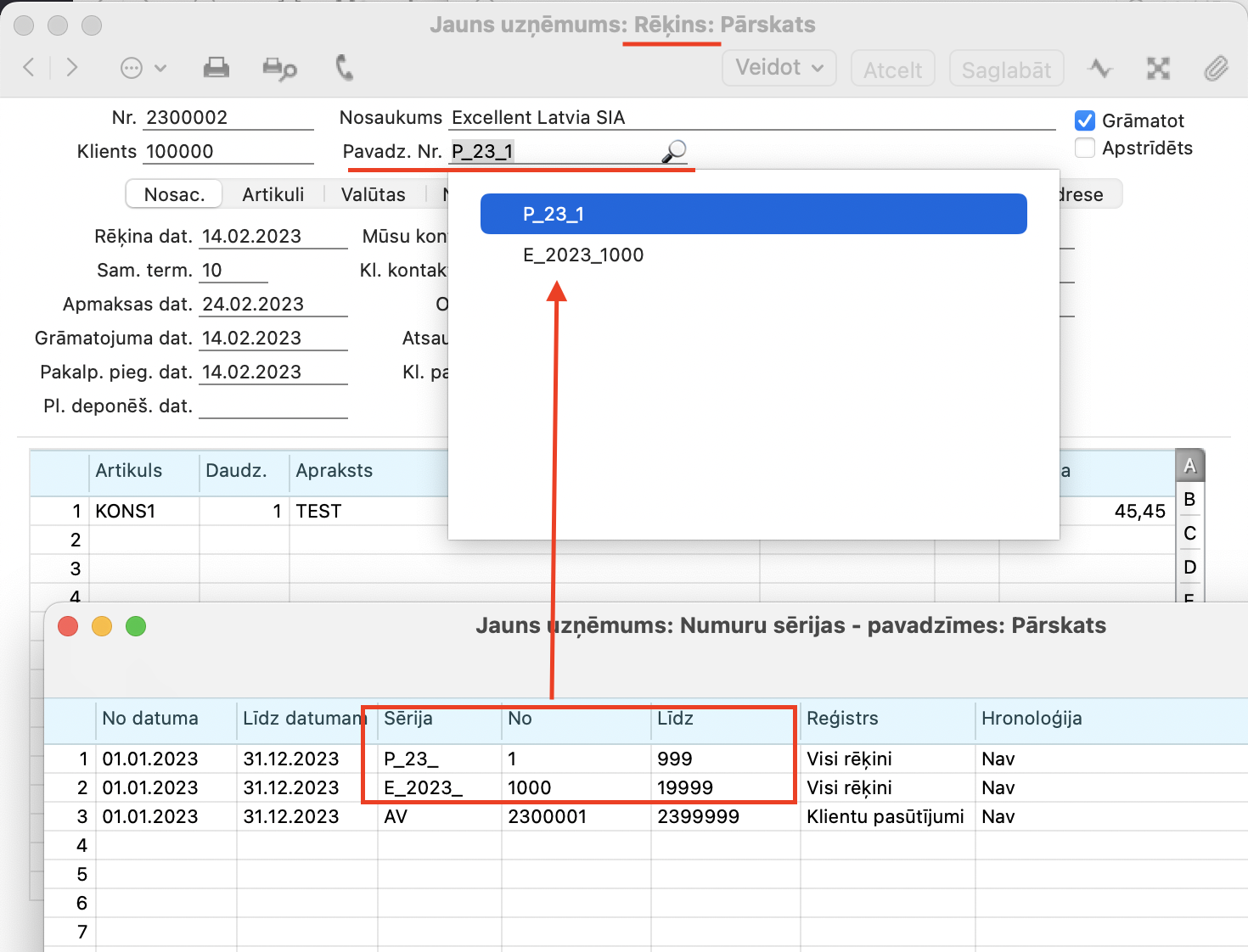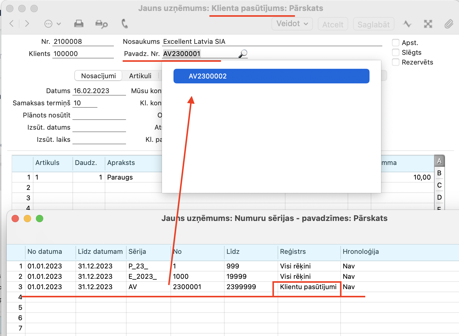 NB! Lūdzu pievērsiet uzmanību tam, lai Pavadzīmes numurs no iestatījuma Numuru sērijas – pavadzīmes atspoguļotos Klienta pasūtījuma ierakstā, ir nepieciešams norādīt konkrēto Reģistru.
