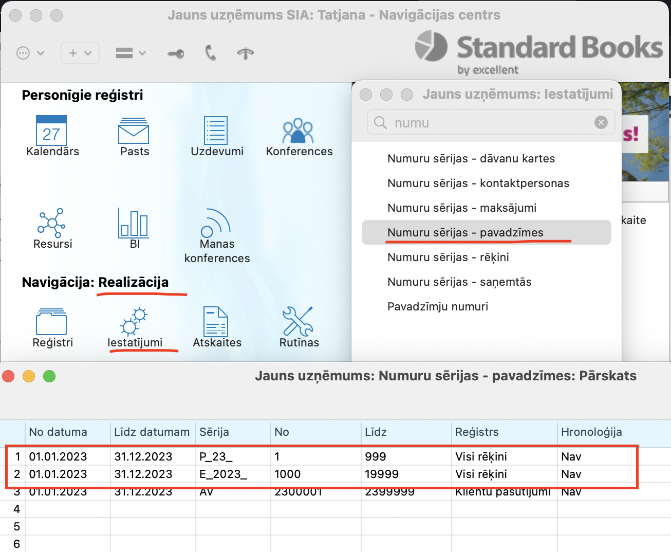 - Lai izvēlnes sarakstā parādītos numuri, jāaiziet uz moduli Realizācija >Iestatījumi > Numuru sērijas – pavadzīmes un jāizveido numurus gan Rēķiniem, gan Klientu pasūtījumiem.