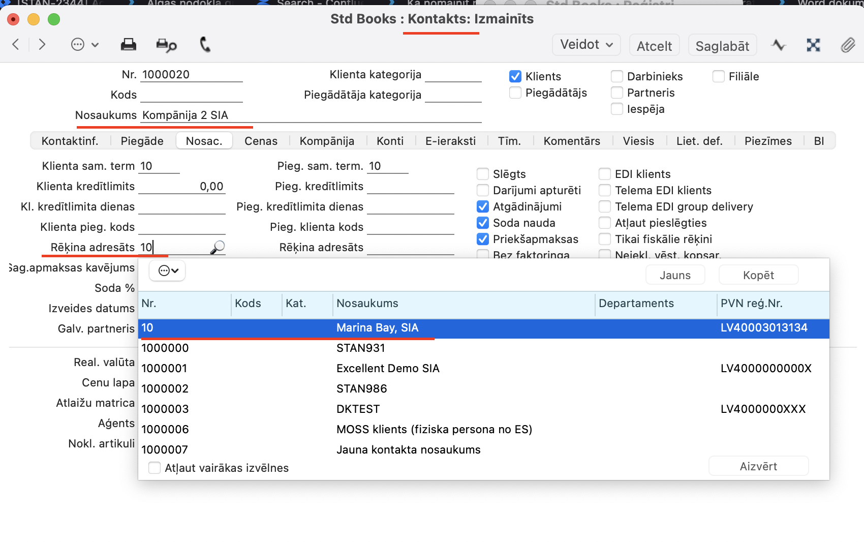 A) Modulī CRM > Reģistri > Kontakti > Kontakta kartītē (piem. 1000020 -Kompānija 2 SIA) sadaļā “Nosacījumi” > aizpildiet lauku “Rēķina adresāts”.