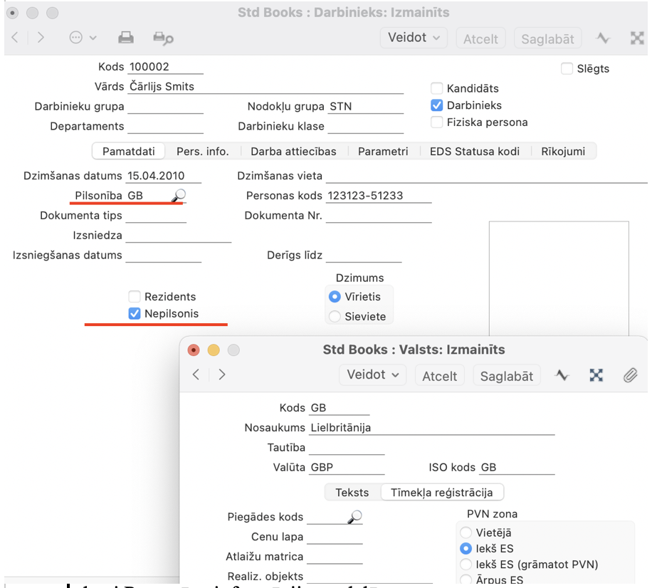 1. Algas > Reģistri > Darbinieki obligāti ir jāatzīmē “Nepilsonis” un jānorāda Pilsonība darbinieka kartītes “Pamatdati” sadaļā. Kā arī jānorāda darbinieka deklarēto adresi kartītes “Personīga informācijas” sadaļā.