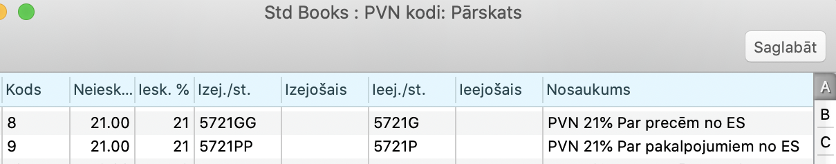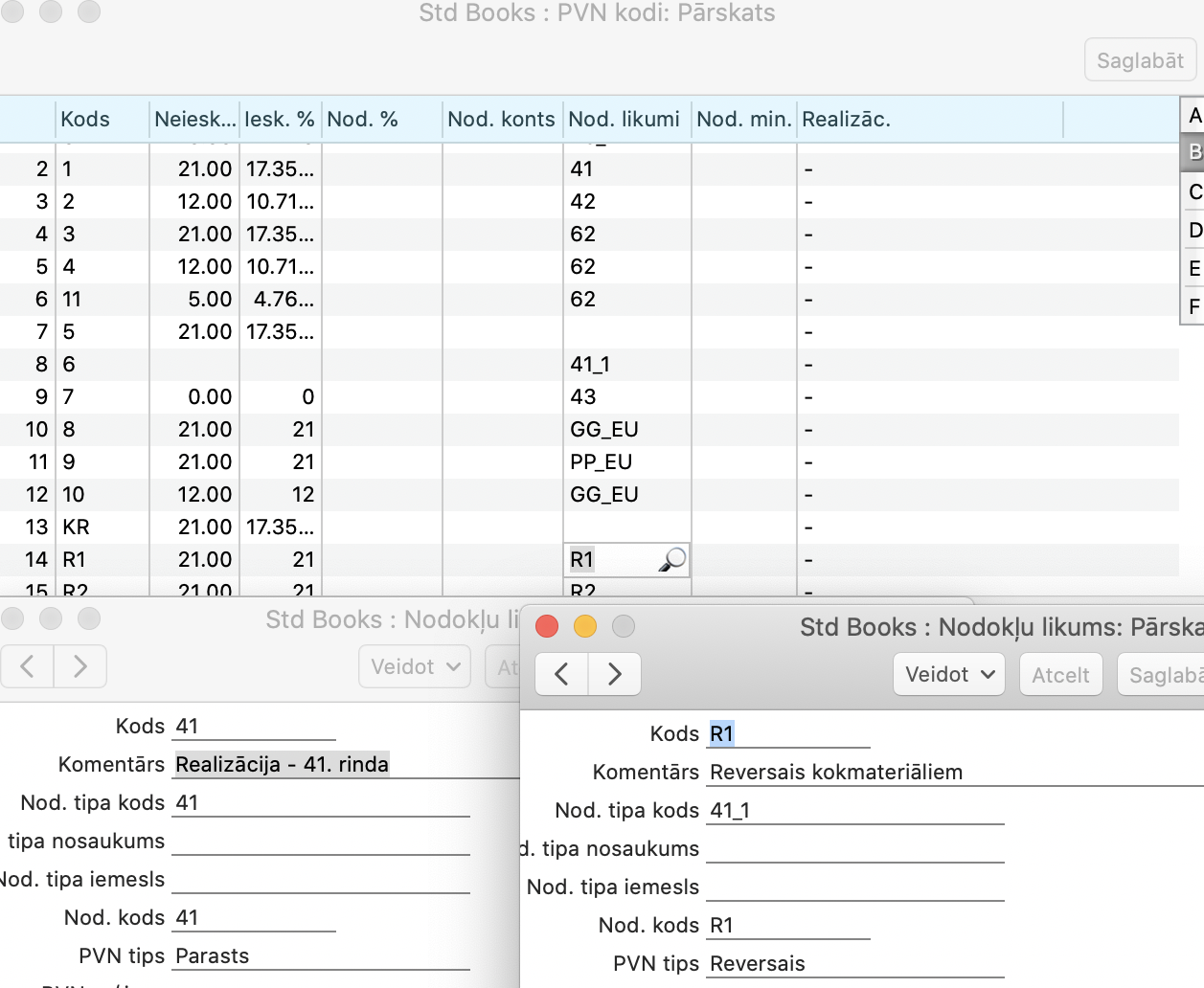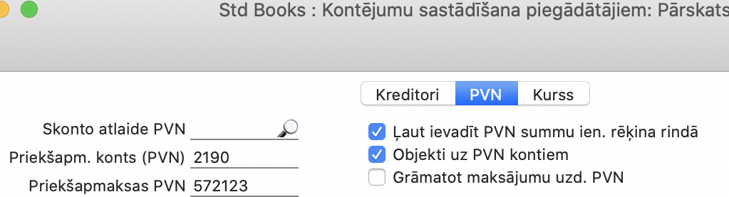 Mēs rekomendējam izmantot “PVN kodi” (Finanses modulis) un PVN sadaļas “Kontējumu sastādīšanas” iestatījumu (Realizācija un Piegādātāji moduļi) konfigurācijas, kuras tiek piedāvātas Standard Books pēc noklusējuma.