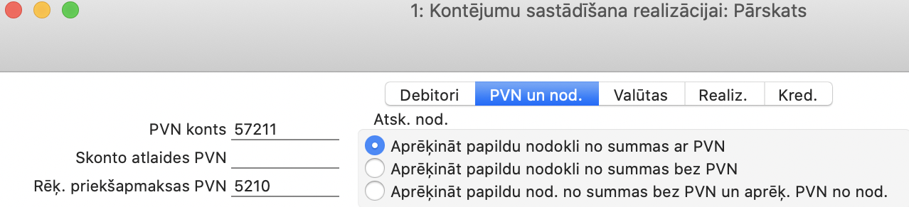 Visos gadījumos, ja konkrētam PVN kodam nav Izejoša konta, tā vietā tiks izmantots PVN konts no iestatījuma Kontējuma sastādīšana realizācija sadaļas “PVN un Nodokļi”.