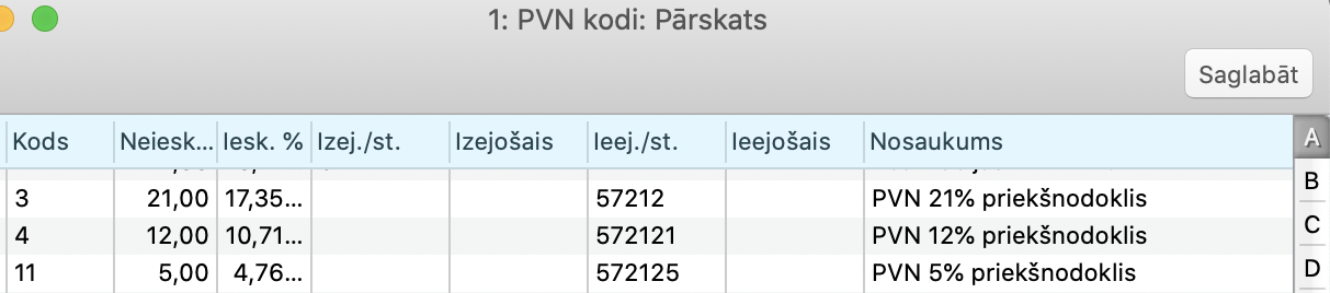 NB! Mainot PVN kodu kontus, ir jāpārliecinās, ka PVN formulā šie jaunie konti tiek ietverti, lai korekti aprēķinātos PVN deklarācijas titullapa eksportējot uz EDS.