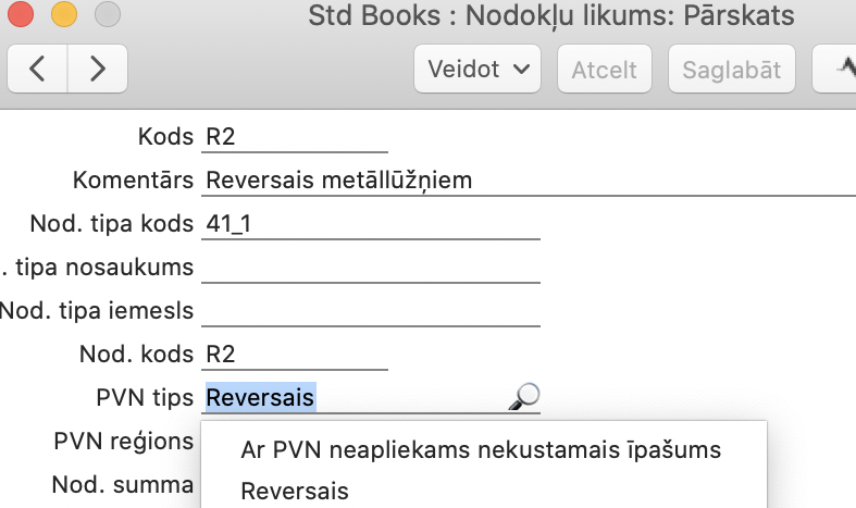 2) Izmantojot izvēlnes sarakstu, izvēlēties laukā attiecīgo PVN tipu. Tas precizēs nodokļa likumu uzvedību. Piemēram, ja vēlaties, lai vietējā zonā grāmatotu reverso PVN no piegādātāja rēķina, kā PVN tipu izvēlieties “Reversais”.