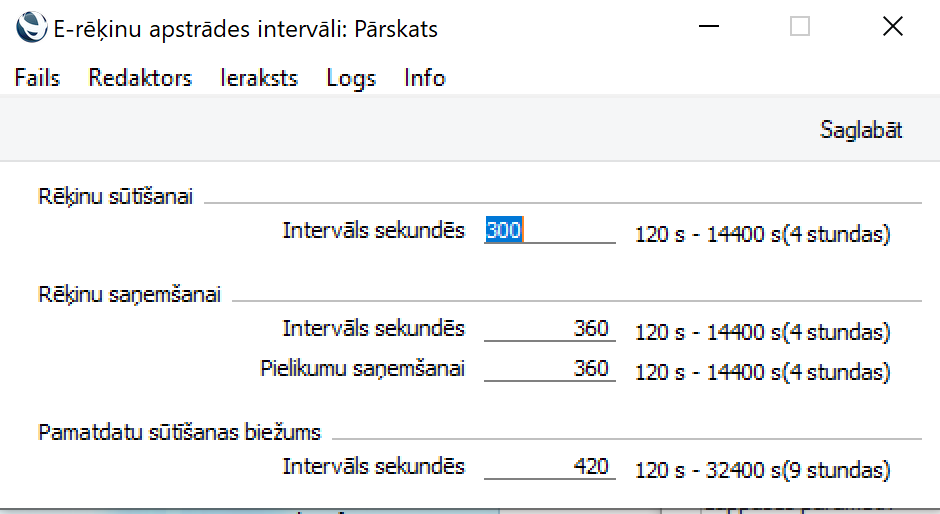 Lai pārbaudītu vai e-rēķinu parametri ir pareizi, atveriet moduļa Sistēma iestatījumu E-rēķina apstrādes intervāli un pārliecinieties vai Rēķinu sūtīšanas un saņemšanas intervāliem ir norādītas vērtības (skatīt bildē zemāk):