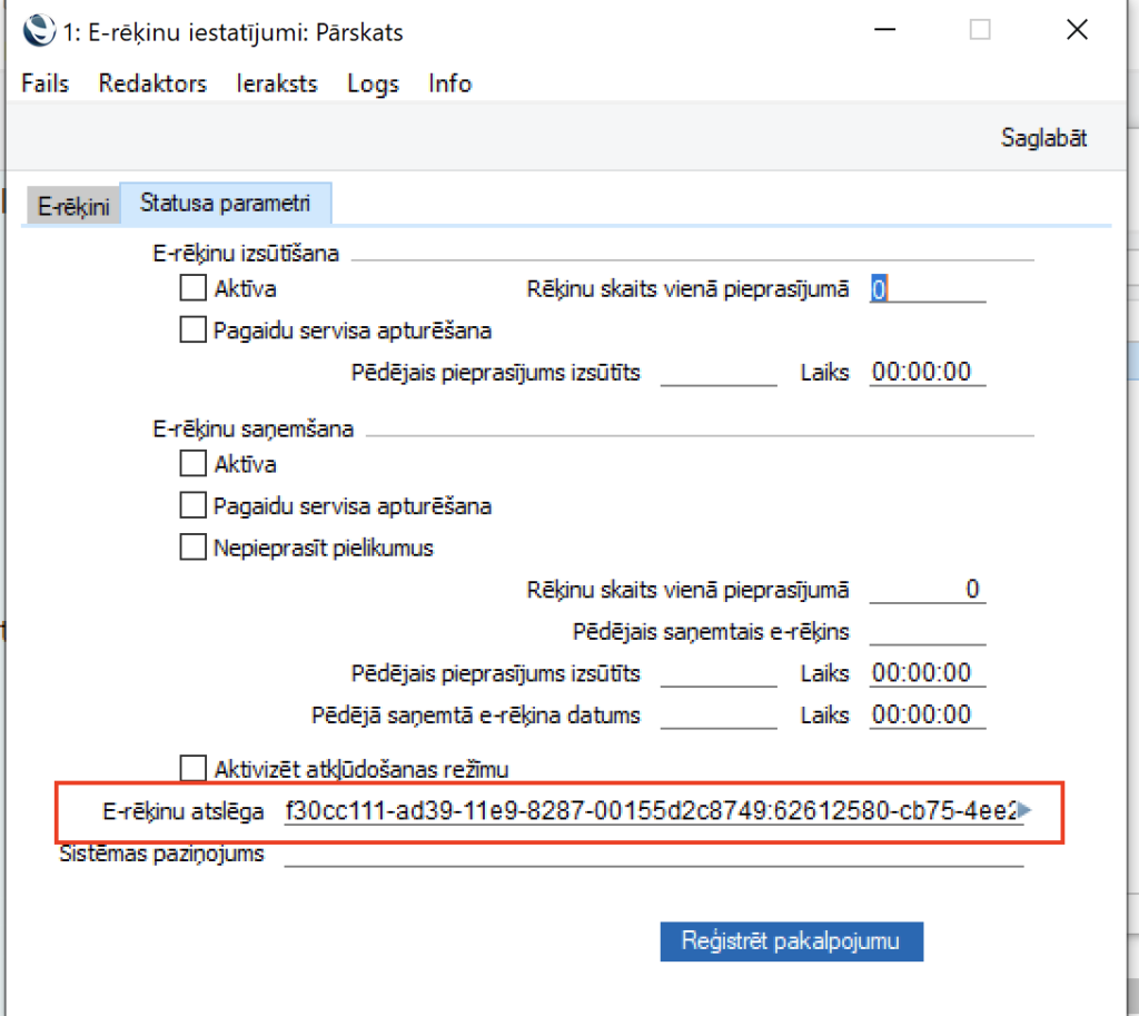 1. Atvērt Sistēmas moduli > Iestatījumi > E-pakalpojumu iestatījumi. Zem tabulas “Statusa parametri” laukā “E-rēķinu atslēga” ievadīt abas iepriekš saņemtās atslēgas, atdalot ar kolu zīmi (piemēram, 29f9999d-8528-11ea-80c2-072637d2c8749:699879980-cb75-4ee2-99ad-8a75f2fde2c0). Spiest “Saglabāt”. Ja gadījumā atveras Faila dialogs to aizvērt un spiest “Saglabāt”. Pirmā atslēga ir e-rēķinu izsūtīšanas un saņemšanas atslēga, otrā atslēga ir FitekIN atslēga (ja tāds papildus līgums noslēgts):