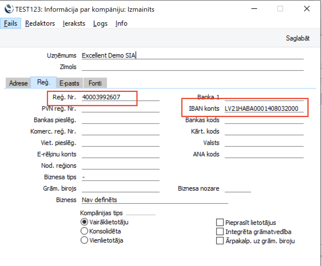 - Sistēmas moduļa iestatījumā Informācija par Kompāniju jābūt norādītam gan reģistrācijas numuram, gan IBAN kontam, turklāt reģistrācijas numuram ir jāsakrīt ar UnifiedPost (Fitek) noslēgto līgumu.