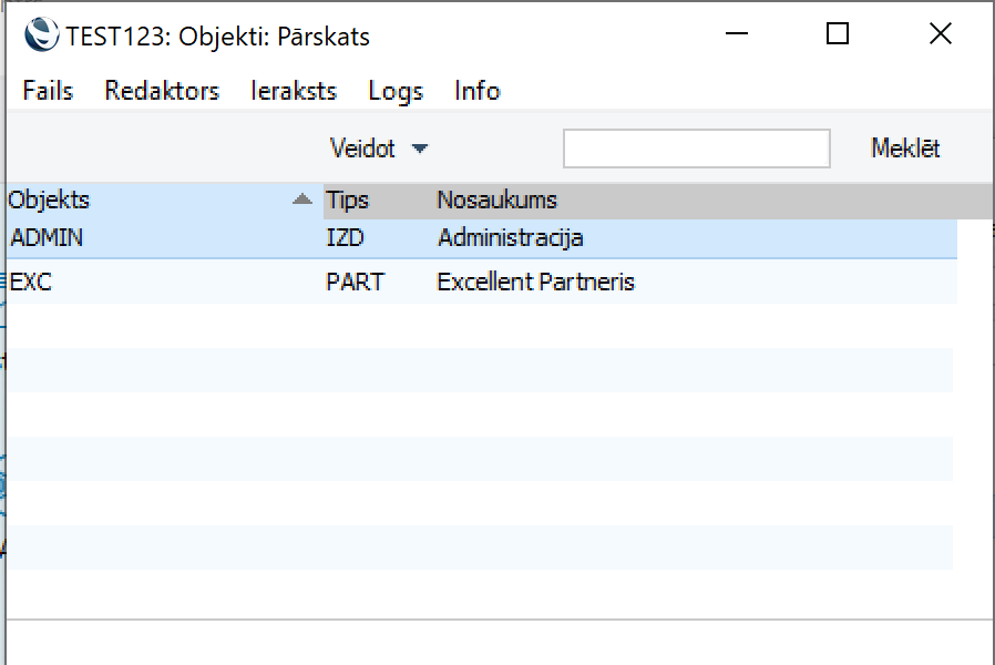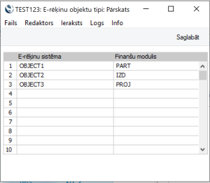 Ja izmantojat arī FitekIn, nepieciešams izveidot Objektu tipu nosaukumu sasaisti starp programmas moduļa Finanses > Reģistri > Objekti un FitekIn E-rēķinu sistēmas Dimensiju reģistru. Sasaiste tiek veikta modulī Sistēma > Iestatījumi > E-rēķinu objekta tipi.