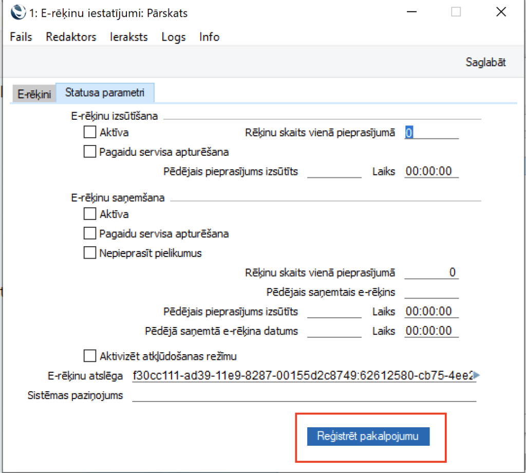 2. Atvērt vēlreiz Sistēmas moduli > Iestatījumi > E-pakalpojumu iestatījumi un nospiest “Reģistrēt pakalpojumu”, “Statusa parametru” tabulā.