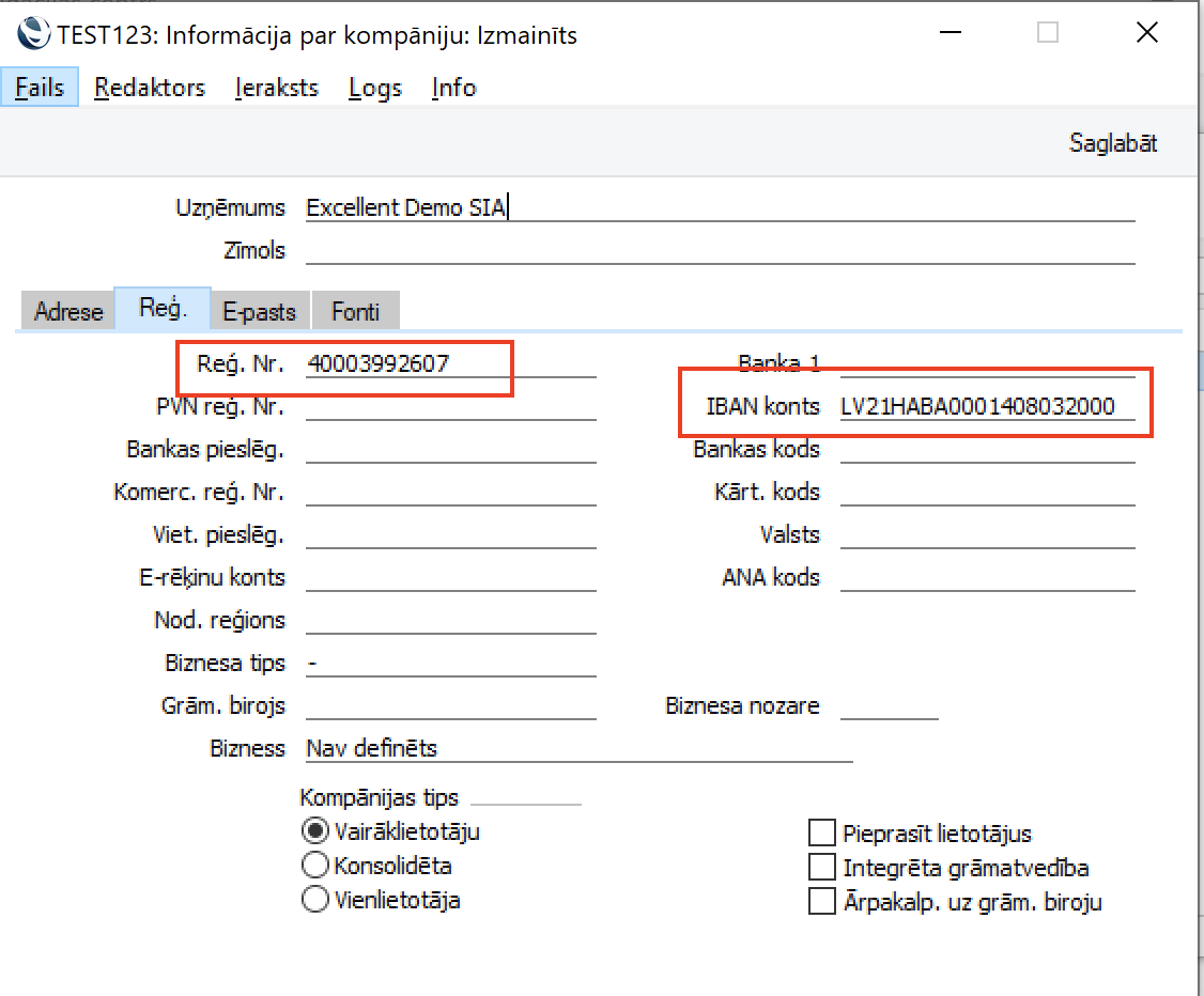 - Sistēmas moduļa iestatījumā Informācija par Kompāniju jābūt norādītam gan reģistrācijas numuram, gan IBAN kontam, turklāt reģistrācijas numuram ir jāsakrīt ar UnifiedPost (Fitek) noslēgto līgumu.