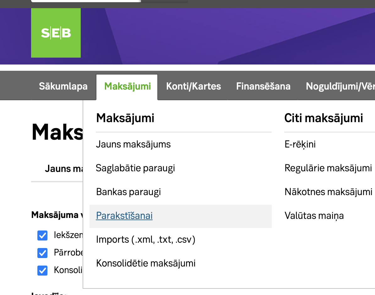 Pēc veiksmīga importa uz SEB banku, maksājuma uzdevums būs pieejams Maksājumos > Parakstīšanai