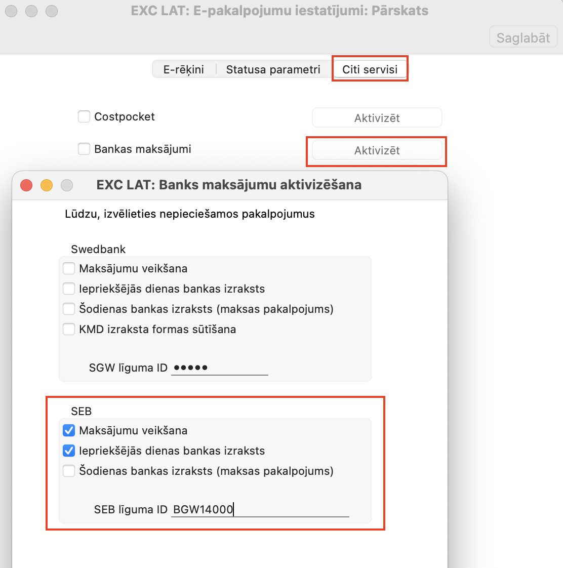 Pēc līguma parakstīšanas, līguma numurs ir jāievada moduļa Sistēma > iestatījumā E-pakalpojumu iestatījumi > sadaļā Citi Servisi. Noklikšķiniet uz pogas “Bankas maksājumi” – Aktivizēt un tiks atvērts jauns logs, kurā ir jānorāda līguma numurs, kā arī jāatzīmē izvēles lauki: