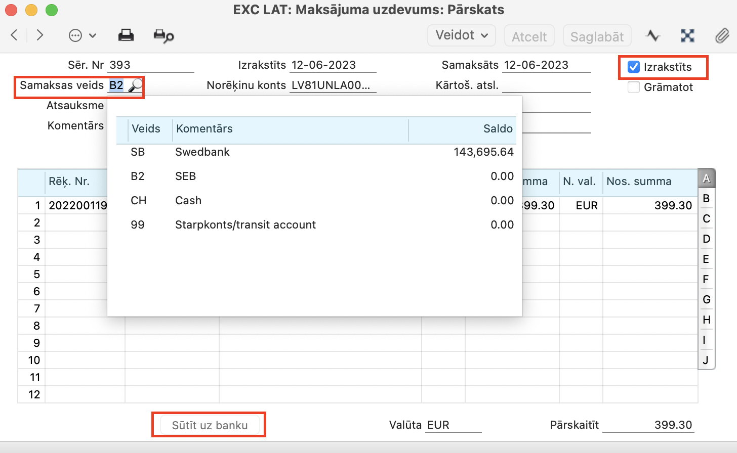 NB! Automātiska “Maksājumu veikšana” SEB bankai no sistēmas tiek atbalstīta sākot no versijas 8.5 2022-10-22-0657