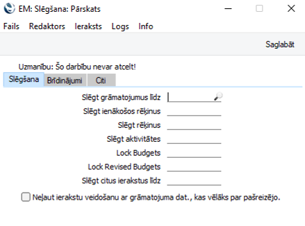 “Brīdināt pirms grāmatojumu veidošanas” – ja šajā laukā ir atzīmēts datums un mēģināt ievadīt grāmatojumus ar šo vai agrāku datumu, ekrānā parādīsies brīdinājums Mēnesis pārbaudīts. Nospiežot paziņojumā “OK”, jūs joprojām varat saglabāt ierakstu.