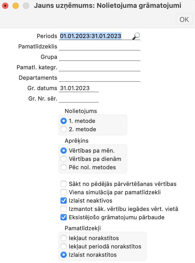 Laukos “Pamatlīdzeklis”, “Grupa”, “Pamatlīdzekļa kategorija”, “Departaments” ielieciet kādu noteikto vērtību, ja vēlaties veidot nolietojumu kādam/iem noteiktiem pamatlīdzeklim. Ja amortizāciju veidosiet visiem pamatlīdzekļiem, atstājiet šos laukus tukšus.