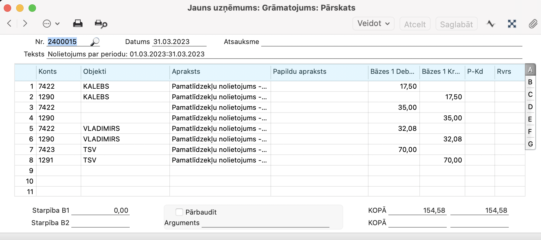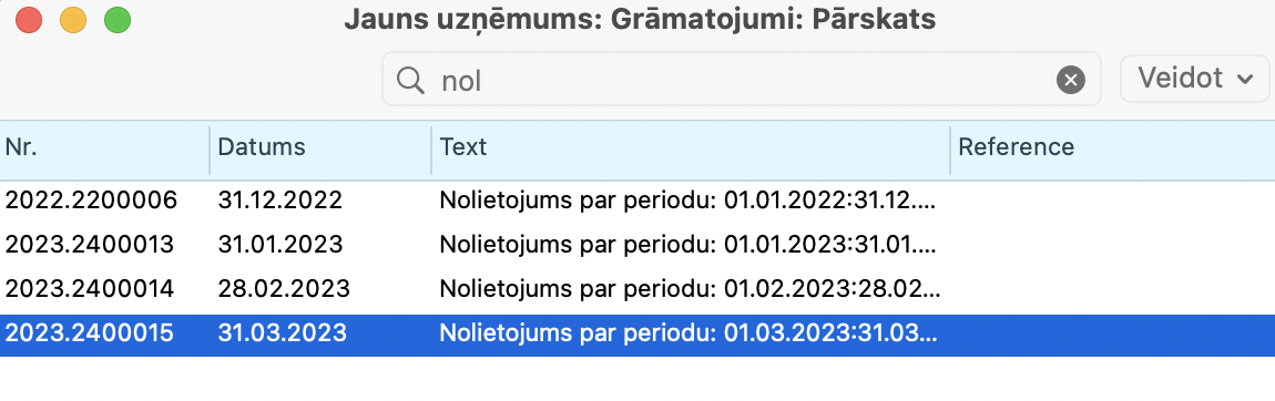 1. Ierakstu modulī Finanses > Reģistri > Grāmatojumi ar Tekstu “Nolietojums par periodu …”