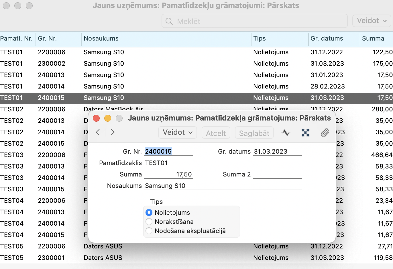 2. Ierakstus Pamatlīdzekļi > Reģistri > Pamatlīdzekļu grāmatojumi katram pamatlīdzeklim atsevišķi