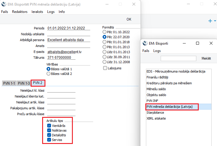 2.2.Ja jūs neizmantojāt EDS API un vēlāties eksportēt PVN deklarāciju kopā ar PVN2 pielikumu (xml formātā), atveriet Finanšu moduli > Rutīnas > Eksports > PVN mēneša deklarāciju (Latvija) > PVN2 un izvēlieties visus Artikulu tipus :