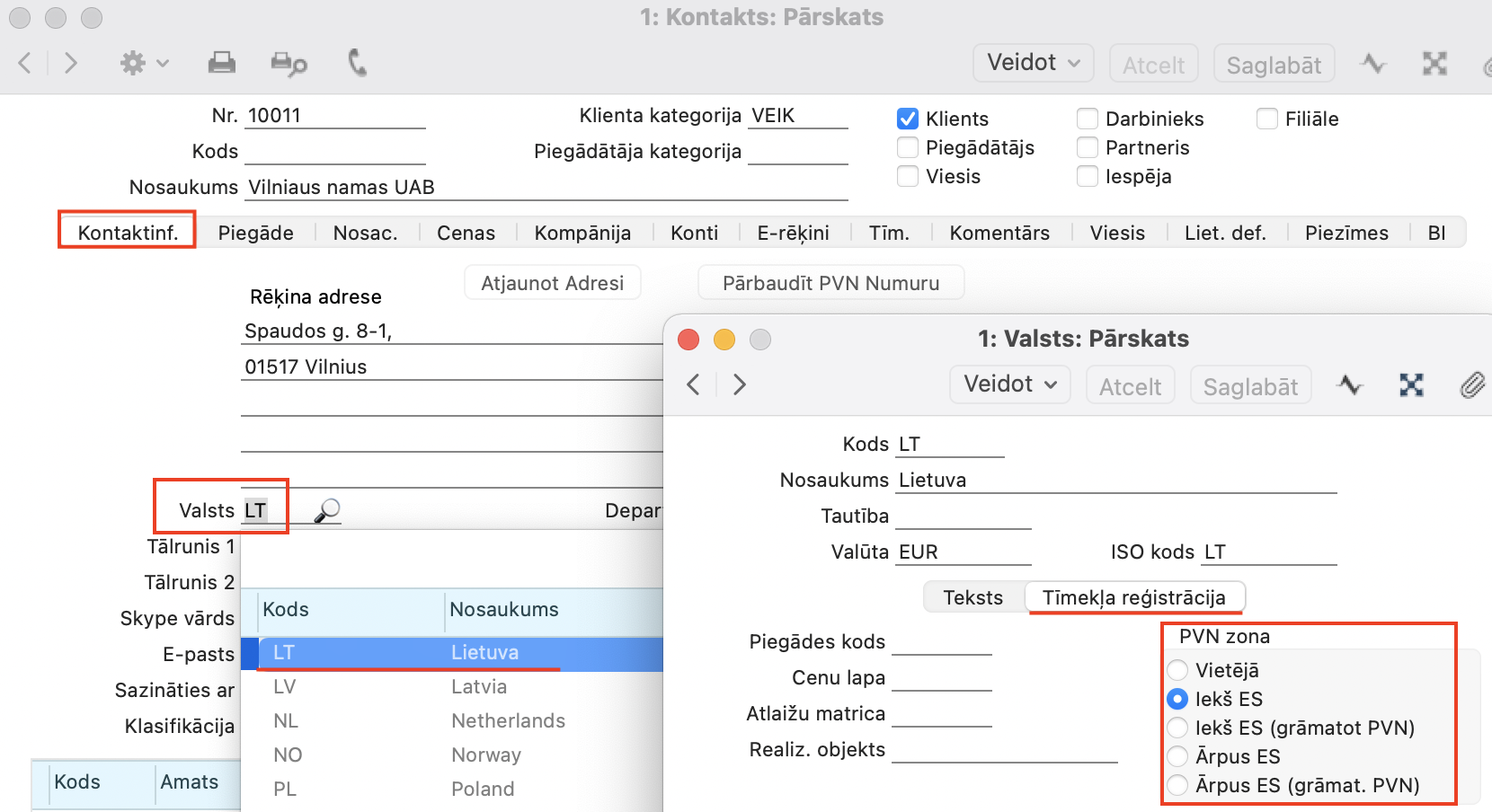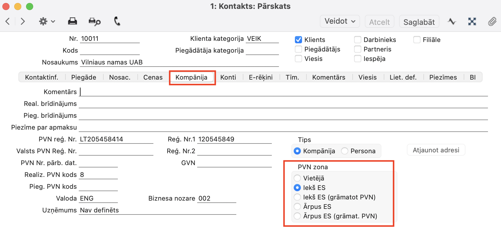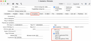 NB! Ja ieraksti neveidojas, tad pārbaudiet Kontakta kartiņā, sadaļā “Kompānija” vai Klientam ir atzīmēts “PVN zona” – iekš ES: