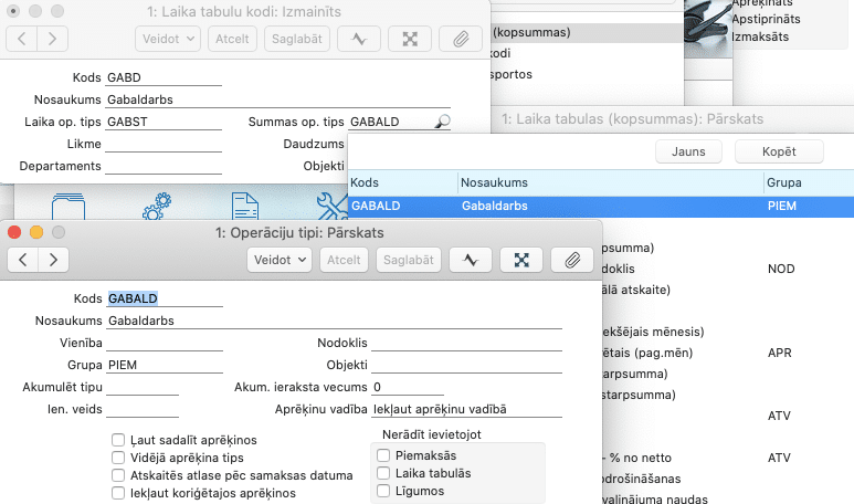 Kods (piemēram, GABD – kas atbilsts Gabaldarbam). Ja jums nav koda, tad to jāizveido iestatījumā “Laika tabulu kodi”. Ja veidojot laika tabulu (kopsummas) ierakstu nebūs norādīts kods, sistēma vienalga aprēķinās algu darbiniekam, jo tā iestatīta algu formula, vienīgais algu aprēķinā neparādīsies atsevišķas rindas ar norādi Gabaldarbs (summa) un Gabaldarbs (stundas)