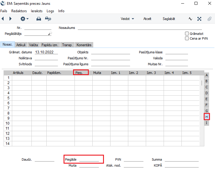 Transporta izmaksas ir iespējams ievadīt modulī Loģistika > reģistrs Saņemtās preces > Veidot – Jauna preču saņemšana > kartiņā kājenes laukā “Piegāde” vai arī H iedaļas slejā “Piegāde”.